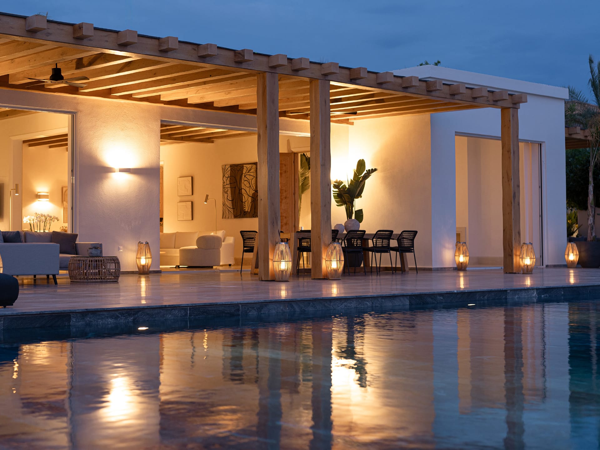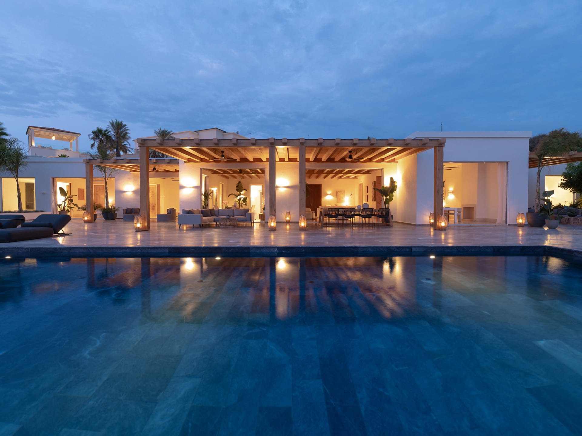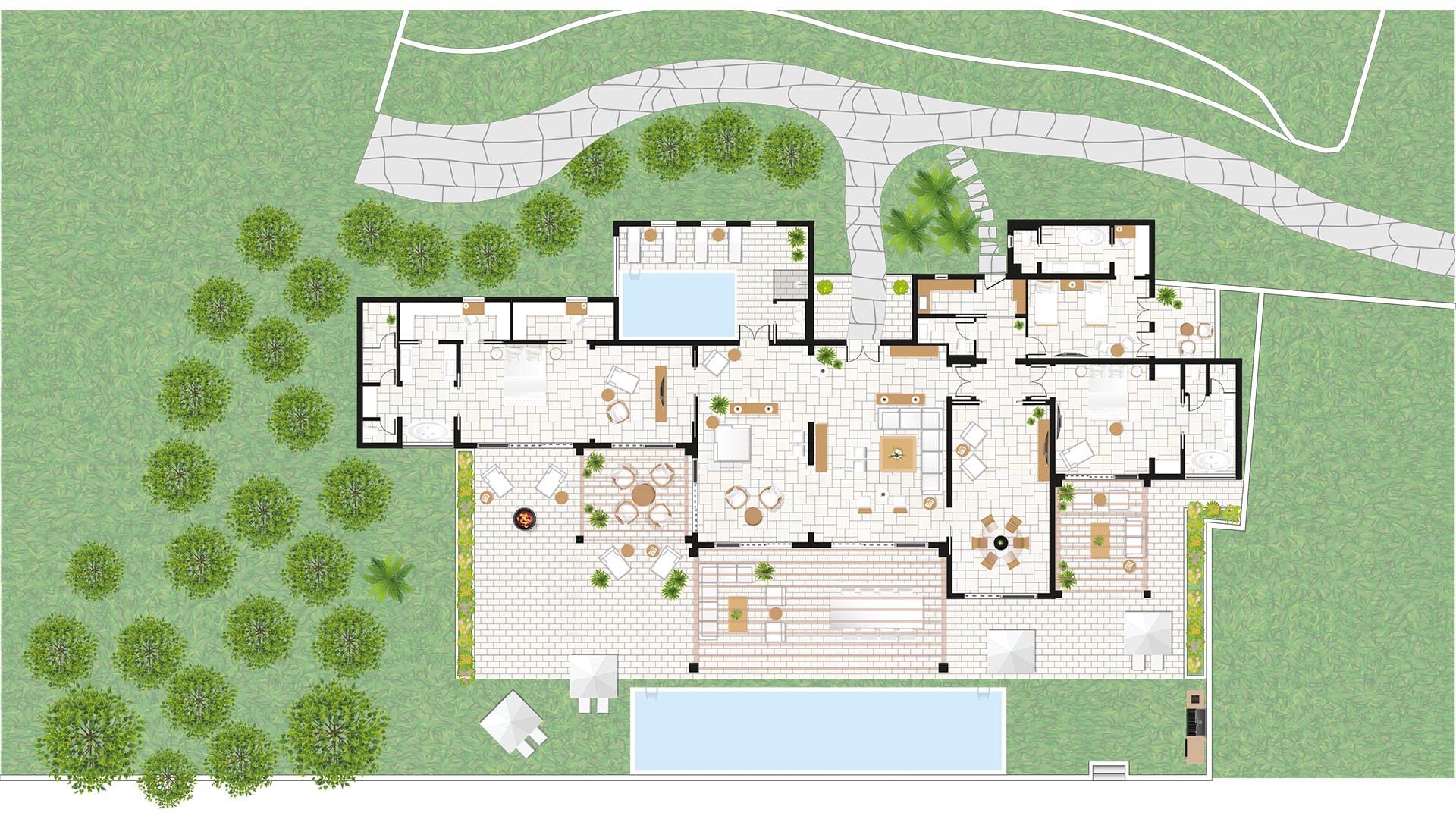 - LAYOUT: Two Master Bedroom Suites. One bedroom with twin beds. Multiple separate living and dining areas with high wood beamed ceilings. Multiple separate outdoor shaded living areas. Kitchen. Indoor Pool with lounge beds. Private massage area. Two entrances
