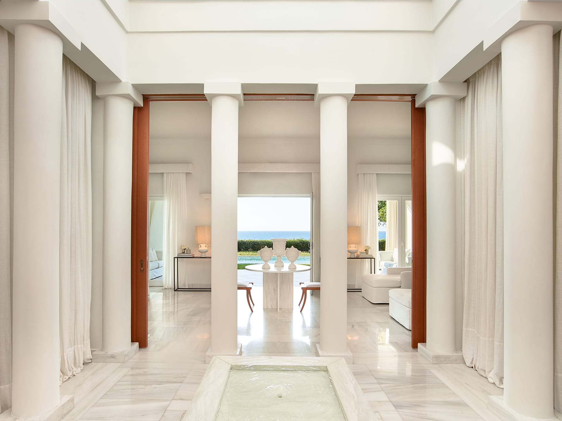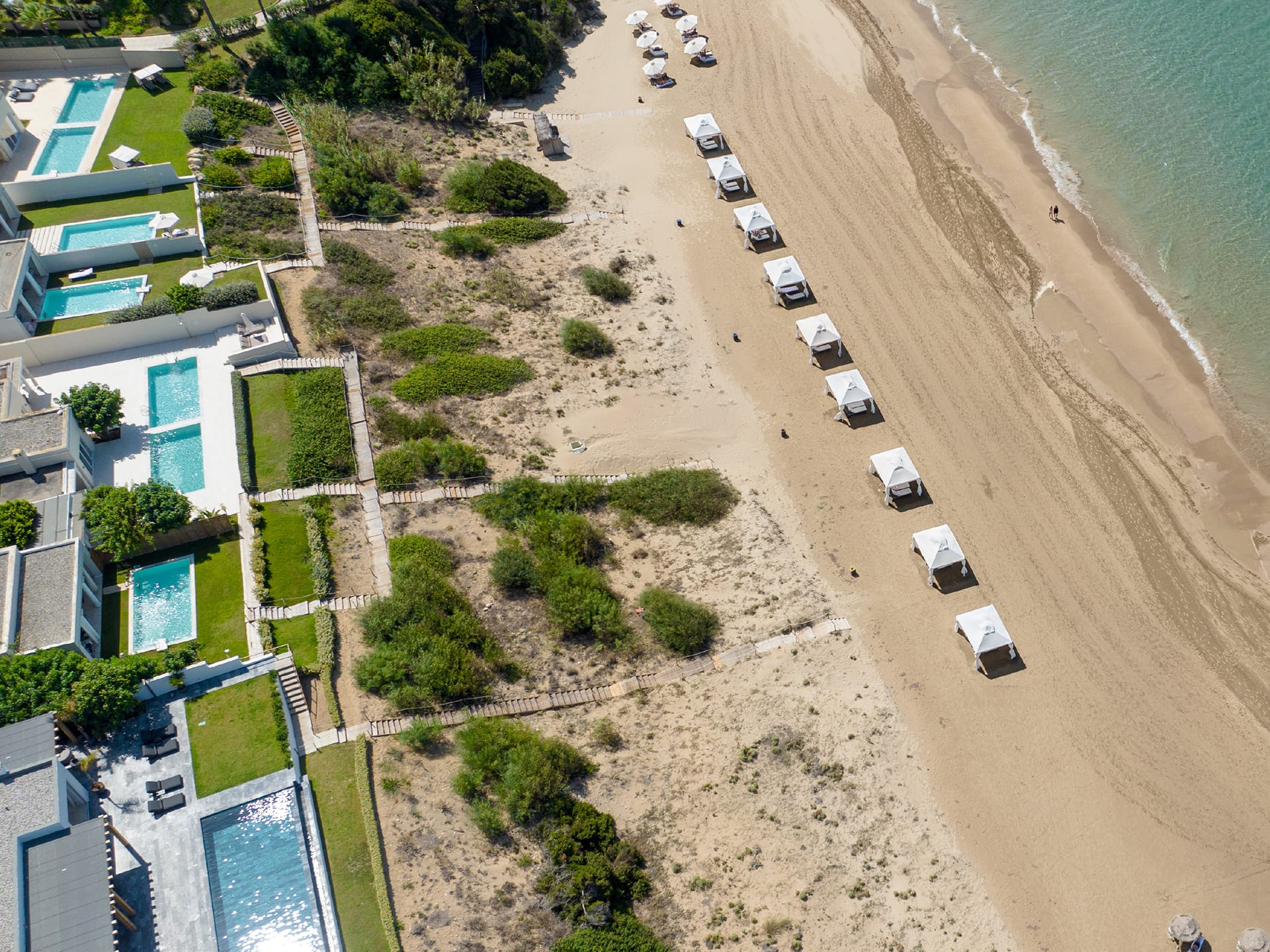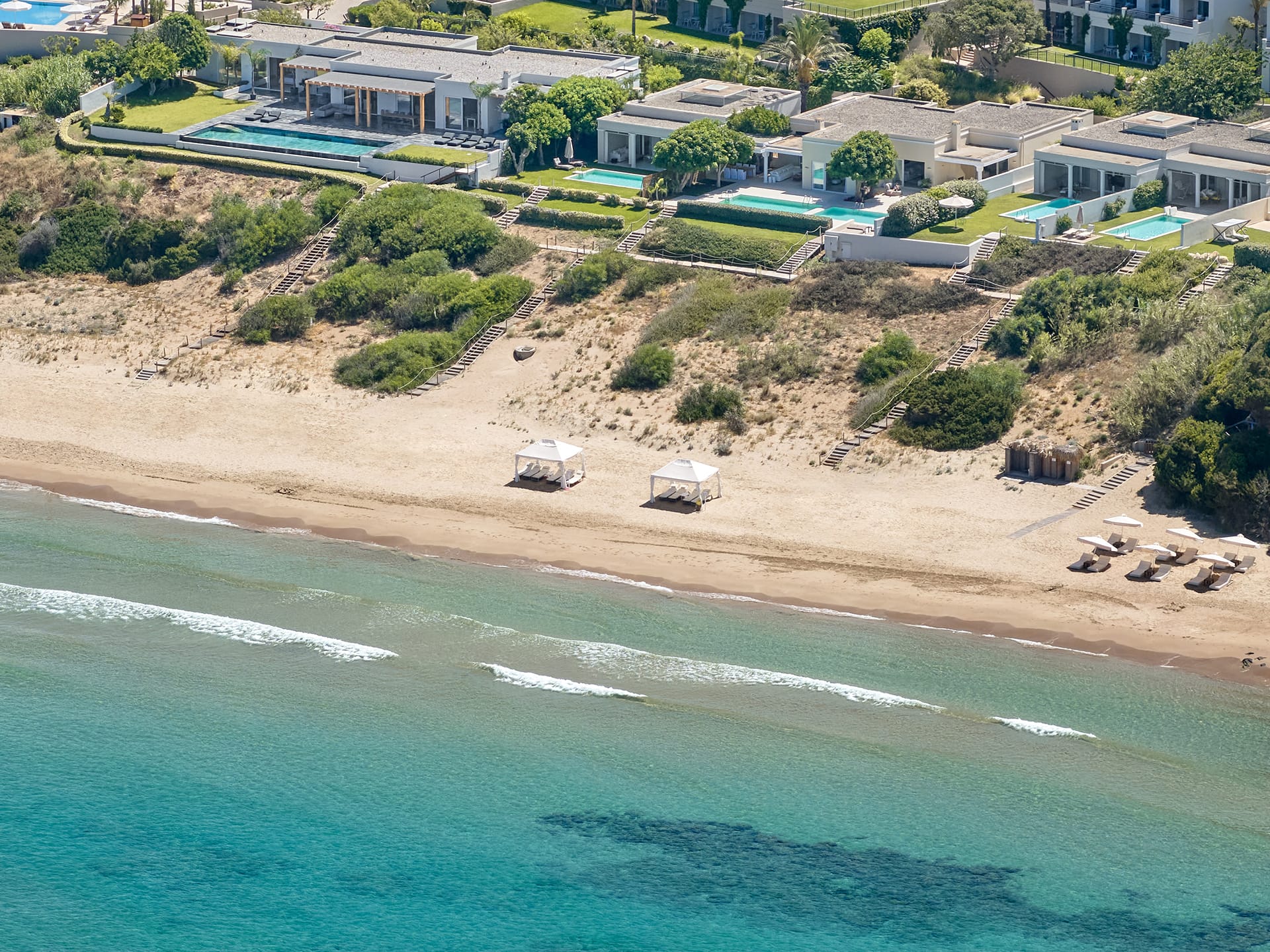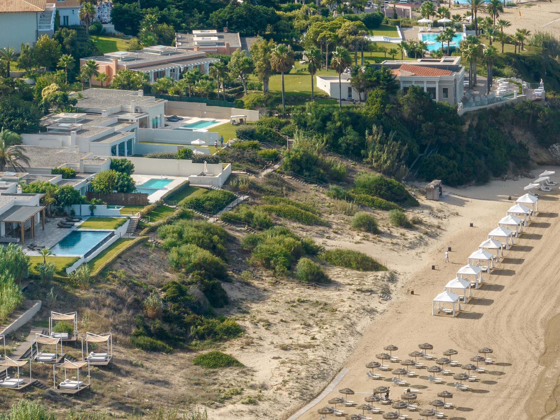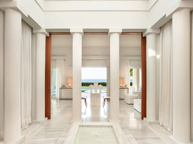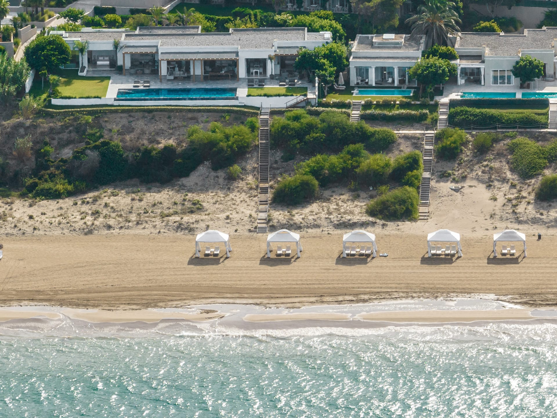 Located in the most exclusive section of Mandola Rosa Riviera, this Grand Sunset Residence offers the most extravagant beachfront setting in the resort with its own private beach cabana. The Residence is set out all in one level with amazing terraces, a grand marble pool and a more private master suite pool; all with infinity views to the sea. There are 5 bedrooms, all in crisp white cotton and linen decoration with luxurious bathrooms. The Grand Master suite is centered around a sparkling skylight with direct sea views, a cool veranda to relax or dine, a his & hers bathroom and a walk-in wardrobe room. The Salon opens to the covered and open air verandas with outdoor cozy cinema, ideal for family time together. Throughout the Residence the luxury of Greek marble, rich wood and works of Art creates a feeling of serenity, all in an amazing natural setting with the sounds of the sea.