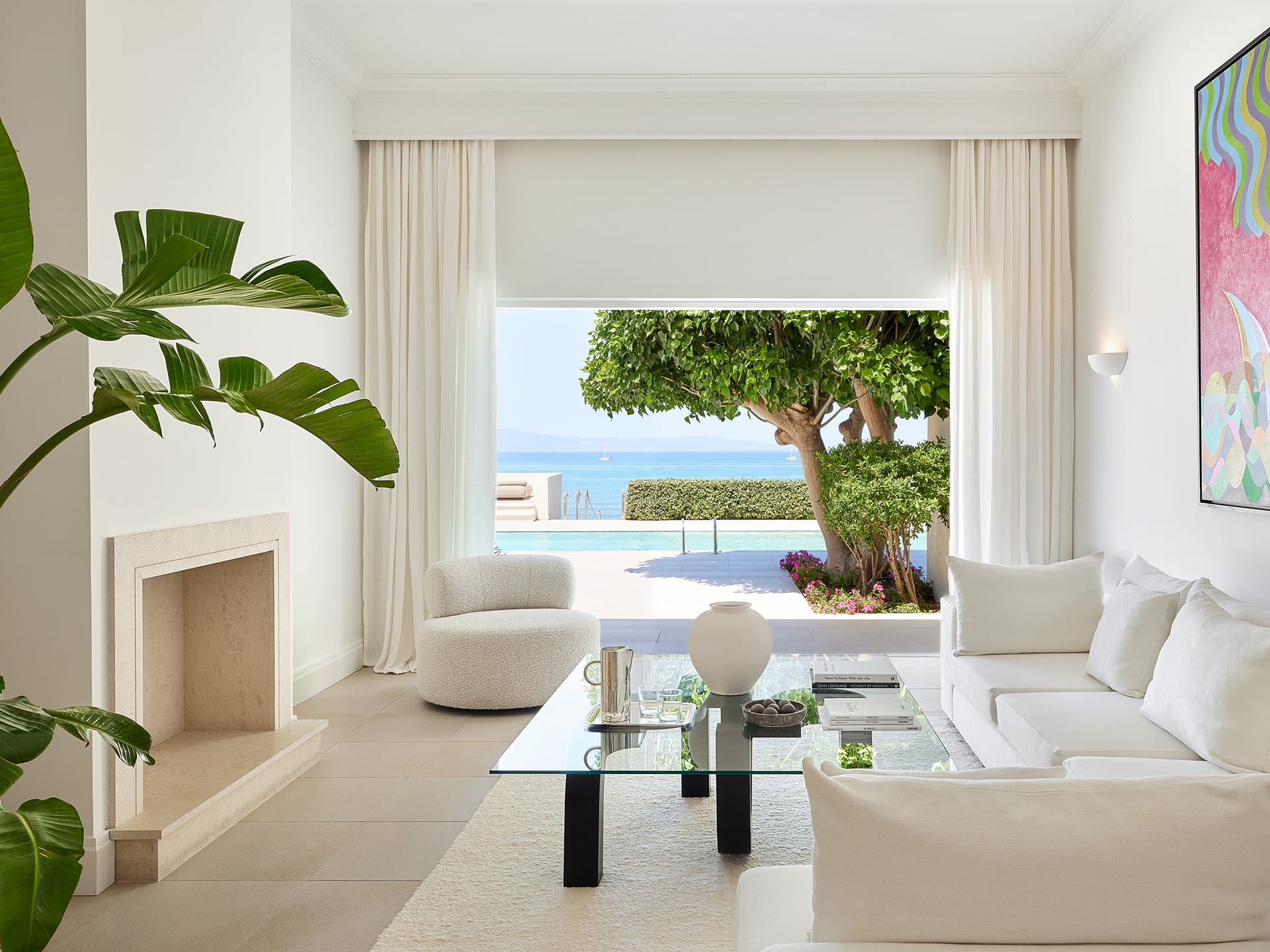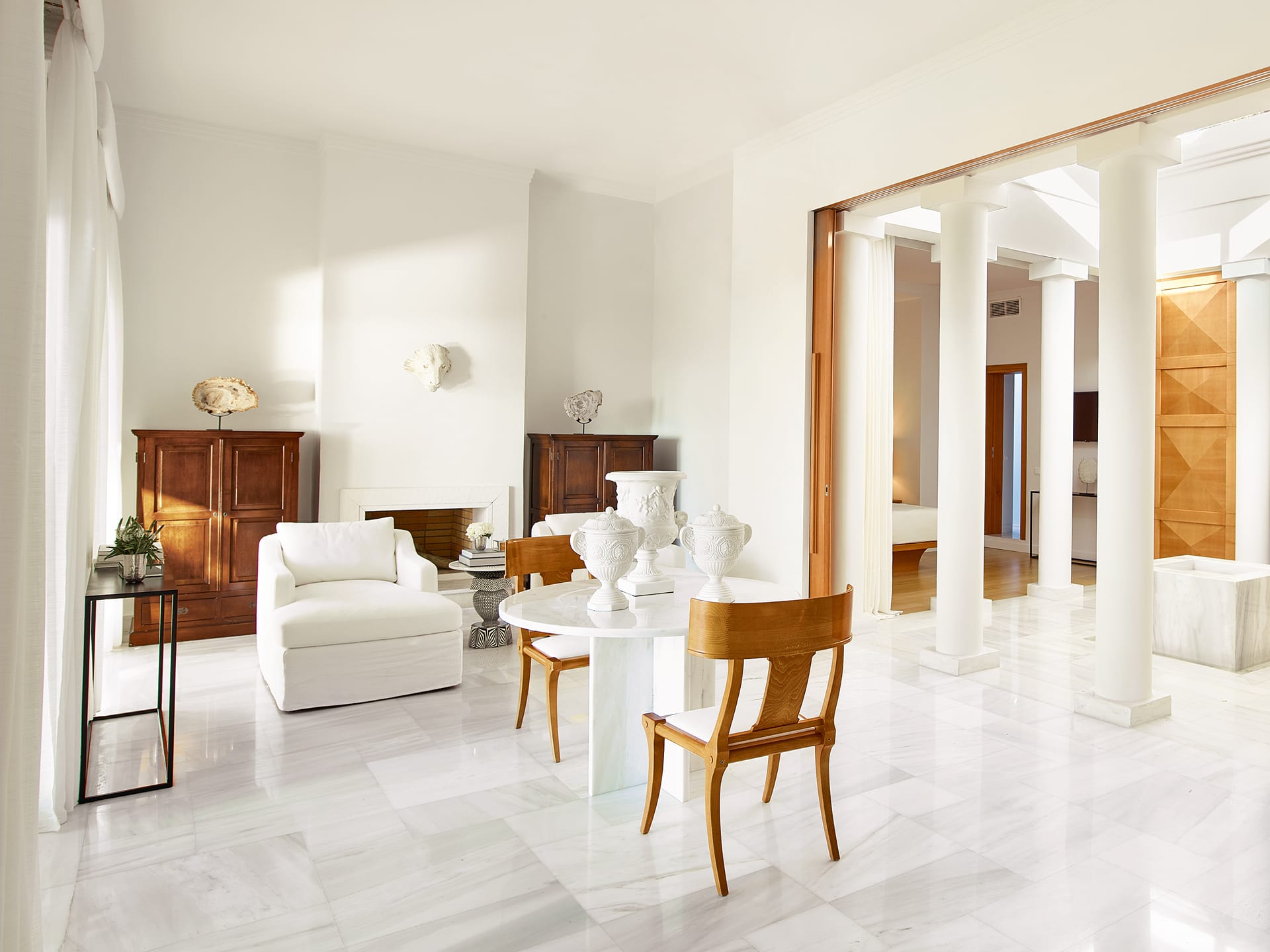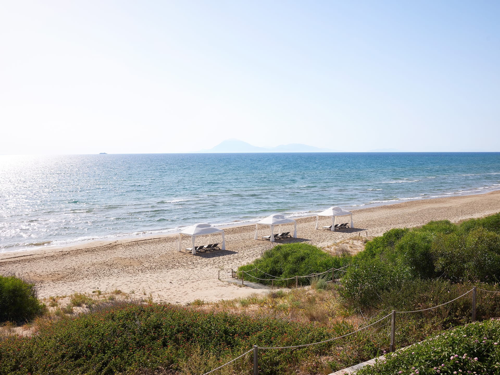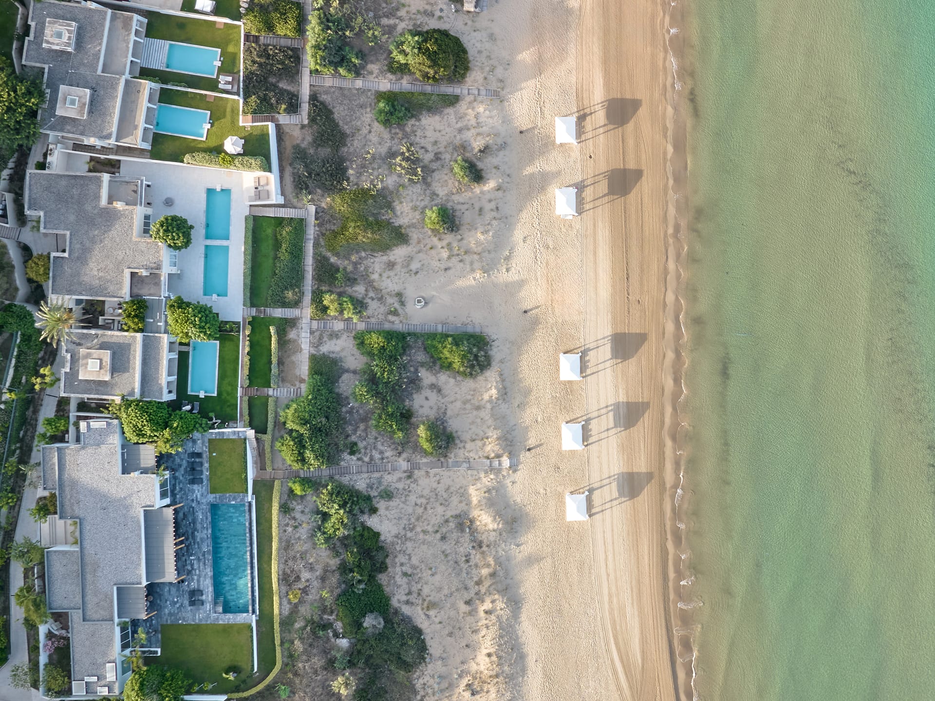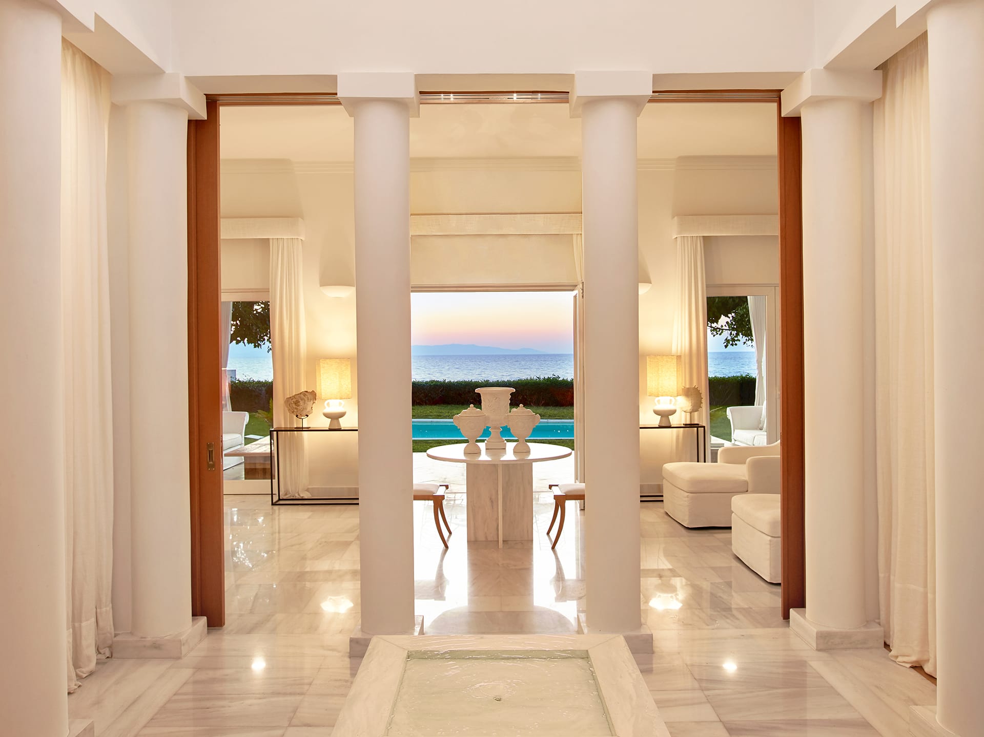 Located in the most exclusive section of Mandola Rosa Riviera, this Grand Sunset Residence offers the most extravagant beachfront setting in the resort with its own private beach cabana. The Residence is set out all in one level with amazing terraces, a grand marble pool and a more private master suite pool; all with infinity views to the sea. There are 5 bedrooms, all in crisp white cotton and linen decoration with luxurious bathrooms. The Grand Master suite is centered around a sparkling skylight with direct sea views, a cool veranda to relax or dine, a his & hers bathroom and a walk-in wardrobe room. The Salon opens to the covered and open air verandas with outdoor cozy cinema, ideal for family time together. Throughout the Residence the luxury of Greek marble, rich wood and works of Art creates a feeling of serenity, all in an amazing natural setting with the sounds of the sea.